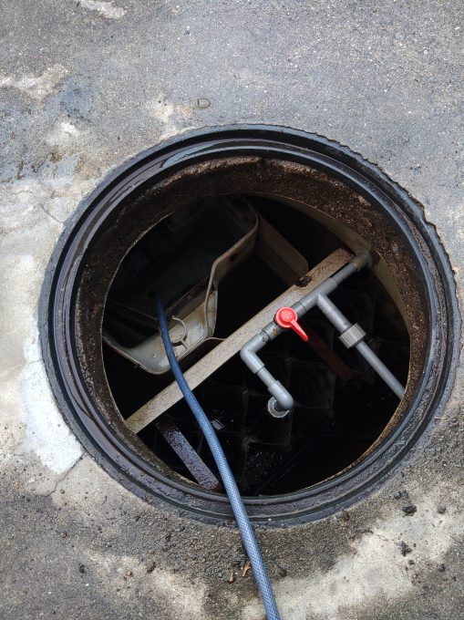 お伺いして点検したところ、浄化槽の汲み取りを数年していなかったらしく、浄化槽が満タンになり、それが原因でトイレ排水管も詰まっている状況でした。