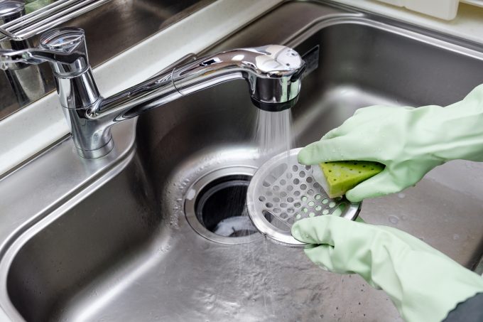 • キッチンの排水口からゴミ受けやワントラップを外し、中性洗剤でヌメリをしっかり除去する。